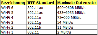 Die ersten beiden Begriffe werden auch als Synonym für WLAN verwendet. Mittlweile wurde die unterschiedlichen IEEE Standards in Ihrer Schreibweise vereinfacht und an die Bezeichungen der Mobilfunkstandards angelehnt (3G, 4G, 5G).